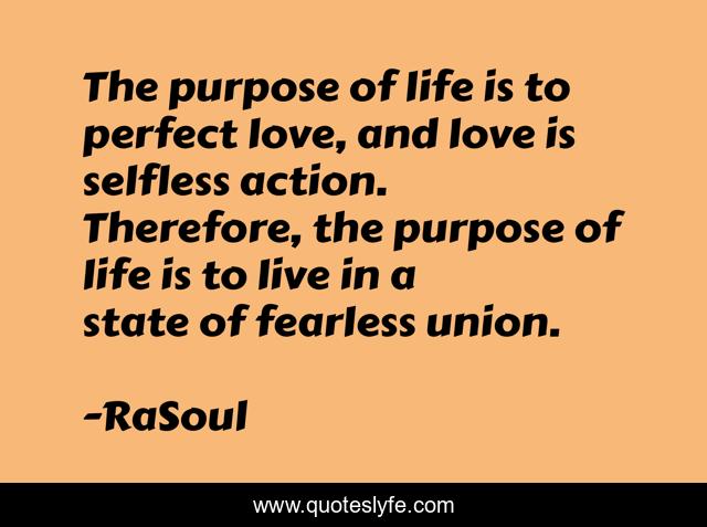 This page presents the quote "The purpose of life is to perfect love, and love is selfless action. Therefore, the purpose of life is to live in a state of fearless union.". Author of this quote is RaSoul. .