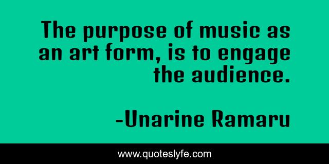 This page presents the quote "The purpose of music as an art form, is to engage the audience.". Author of this quote is Unarine Ramaru. This quote is about life, art, empower, engagement, imagination, audience, music, evoke, feeling,.