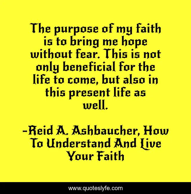 This page presents the quote "The purpose of my faith is to bring me hope without fear. This is not only beneficial for the life to come, but also in this present life as well.". Author of this quote is Reid A. Ashbaucher, How To Understand And Live Your Faith. This quote is about faith, reid-ashbaucher, christian-living, christianity,.