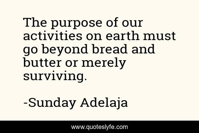 This page presents the quote "The purpose of our activities on earth must go beyond bread and butter or merely surviving.". Author of this quote is Sunday Adelaja. This quote is about activities, bread-and-butter, purpose, earth, survivimg,.