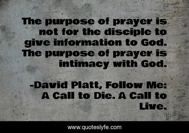 This page presents the quote "The purpose of prayer is not for the disciple to give information to God. The purpose of prayer is intimacy with God.". Author of this quote is David Platt, Follow Me: A Call to Die. A Call to Live.. .