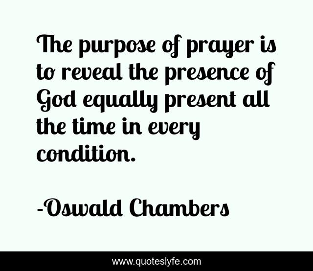This page presents the quote "The purpose of prayer is to reveal the presence of God equally present all the time in every condition.". Author of this quote is Oswald Chambers. .
