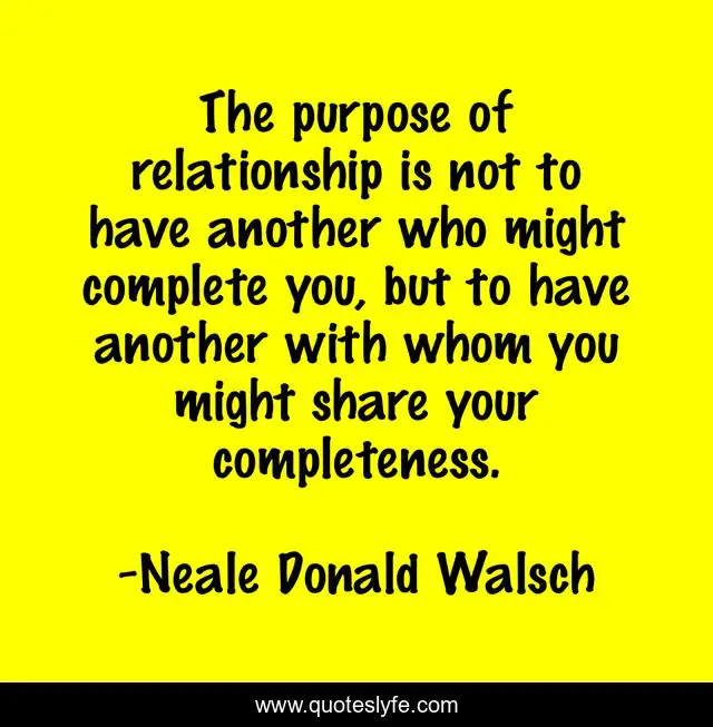 This page presents the quote "The purpose of relationship is not to have another who might complete you, but to have another with whom you might share your completeness.". Author of this quote is Neale Donald Walsch. This quote is about love, affection,.