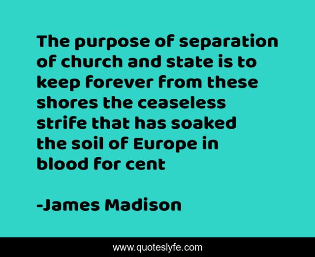 This page presents the quote "The purpose of separation of church and state is to keep forever from these shores the ceaseless strife that has soaked the soil of Europe in blood for cent". Author of this quote is James Madison. This quote is about europe, organized-religion, separation-of-church-and-state, religion, politics, history,.