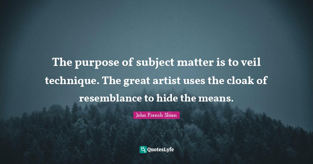 This page presents the quote "The purpose of subject matter is to veil technique. The great artist uses the cloak of resemblance to hide the means.". Author of this quote is John French Sloan. This quote is about purpose, technique, resemblance, mean, artist, great artist, subject matter,.