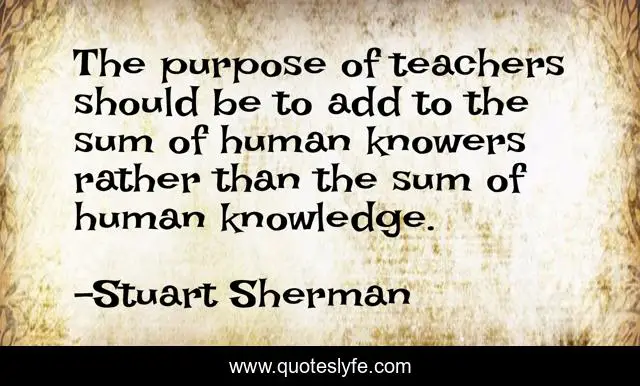 This page presents the quote "The purpose of teachers should be to add to the sum of human knowers rather than the sum of human knowledge.". Author of this quote is Stuart Sherman. This quote is about teaching, teachers,.