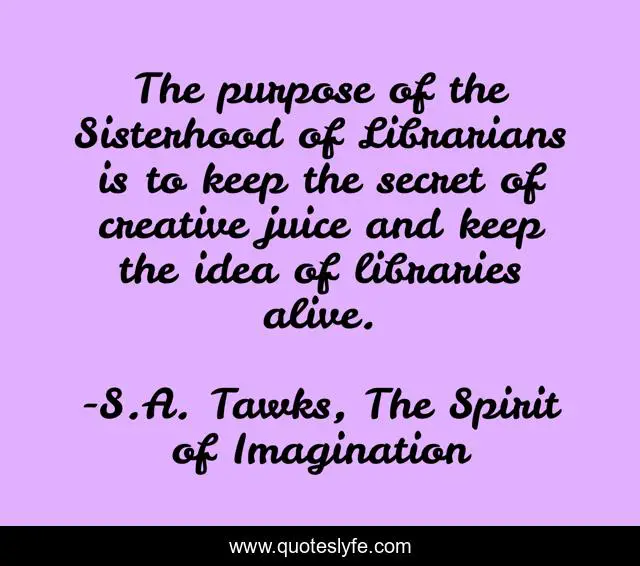 "S.A. Tawks, The Spirit of Imagination Quotes." Quoteslyfe.com, 2025. Sat. 06 Dec. 2025. <https://www.quoteslyfe.com/quote/The-purpose-of-the-Sisterhood-of-Librarians-126104>.