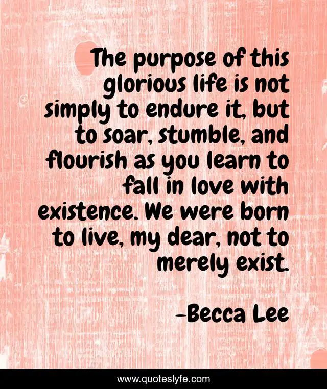 This page presents the quote "The purpose of this glorious life is not simply to endure it, but to soar, stumble, and flourish as you learn to fall in love with existence. We were born to live, my dear, not to merely exist.". Author of this quote is Becca Lee. This quote is about enthusiasm, life, self-love, inspirational,.