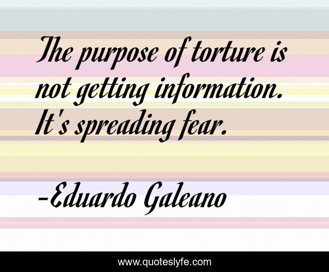 This page presents the quote "The purpose of torture is not getting information. It's spreading fear.". Author of this quote is Eduardo Galeano. This quote is about information, purpose,.