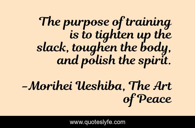 This page presents the quote "The purpose of training is to tighten up the slack, toughen the body, and polish the spirit.". Author of this quote is Morihei Ueshiba, The Art of Peace. This quote is about spiritual, positive, motivational, training, optimistic, inspirational, enthusiasm, confidence,.