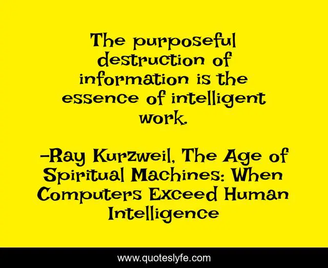 This page presents the quote "The purposeful destruction of information is the essence of intelligent work.". Author of this quote is Ray Kurzweil, The Age of Spiritual Machines: When Computers Exceed Human Intelligence. This quote is about minimalism, creativity,.