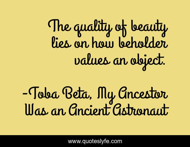 This page presents the quote "The quality of beauty lies on how beholder values an object.". Author of this quote is Toba Beta, My Ancestor Was an Ancient Astronaut. This quote is about beholder, object, quality, beauty, value,.