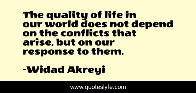 This page presents the quote "The quality of life in our world does not depend on the conflicts that arise, but on our response to them.". Author of this quote is Widad Akreyi. This quote is about enthusiasm, peace, war, inspirational,.
