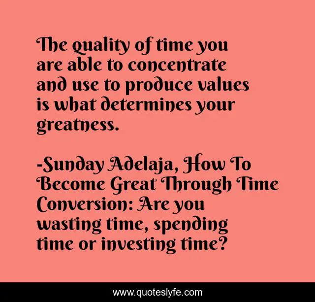 "Sunday Adelaja, How To Become Great Through Time Conversion: Are you wasting time, spending time or investing time? Quotes." Quoteslyfe.com, 2025. Fri. 05 Dec. 2025. <https://www.quoteslyfe.com/quote/The-quality-of-time-you-are-able-39356>.