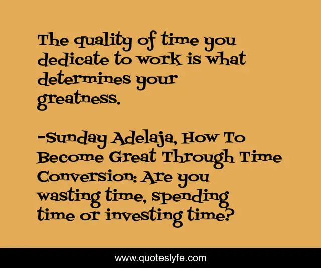 This page presents the quote "The quality of time you dedicate to work is what determines your greatness.". Author of this quote is Sunday Adelaja, How To Become Great Through Time Conversion: Are you wasting time, spending time or investing time?. This quote is about work, life, dedication-to-work, conversion, productivity, wealth, greatness, waste, humanity,.