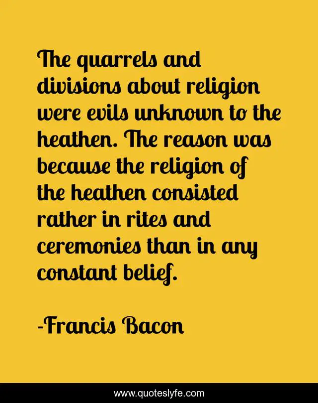 This page presents the quote "The quarrels and divisions about religion were evils unknown to the heathen. The reason was because the religion of the heathen consisted rather in rites and ceremonies than in any constant belief.". Author of this quote is Francis Bacon. This quote is about unknown, reason, belief,.