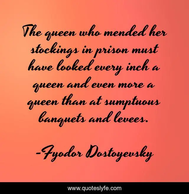 This page presents the quote "The queen who mended her stockings in prison must have looked every inch a queen and even more a queen than at sumptuous banquets and levees.". Author of this quote is Fyodor Dostoyevsky. This quote is about pride, honor,.