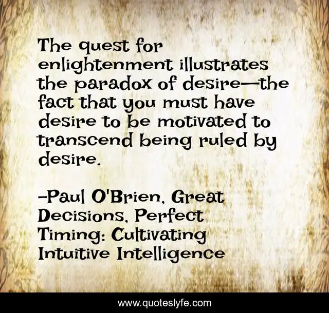 This page presents the quote "The quest for enlightenment illustrates the paradox of desire—the fact that you must have desire to be motivated to transcend being ruled by desire.". Author of this quote is Paul O'Brien, Great Decisions, Perfect Timing: Cultivating Intuitive Intelligence. This quote is about desire, transcendence, enlightenment, inspiration,.