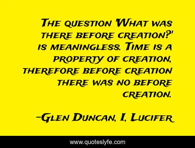 This page presents the quote "The question 'What was there before creation?' is meaningless. Time is a property of creation, therefore before creation there was no before creation.". Author of this quote is Glen Duncan, I, Lucifer. This quote is about story, bible, creation, meaningless, lucifer, time,.