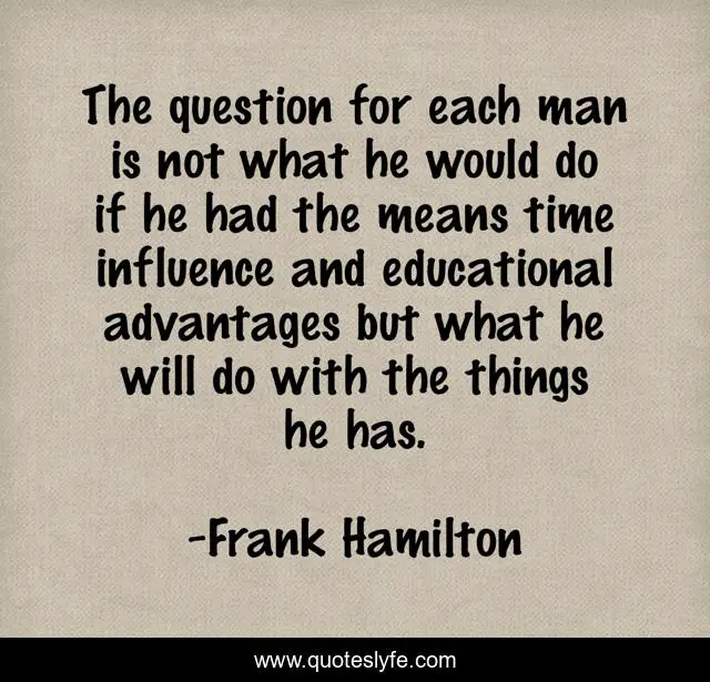 This page presents the quote "The question for each man is not what he would do if he had the means time influence and educational advantages but what he will do with the things he has.". Author of this quote is Frank Hamilton. This quote is about going, getting,.