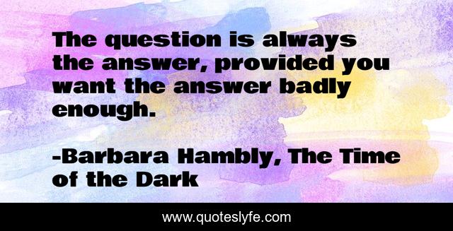 This page presents the quote "The question is always the answer, provided you want the answer badly enough.". Author of this quote is Barbara Hambly, The Time of the Dark. This quote is about fantasy, advice,.