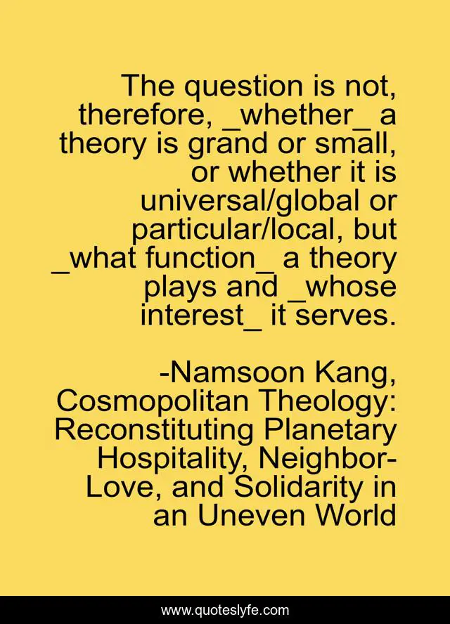 This page presents the quote "The question is not, therefore, _whether_ a theory is grand or small, or whether it is universal/global or particular/local, but _what function_ a theory plays and _whose interest_ it serves.". Author of this quote is Namsoon Kang, Cosmopolitan Theology: Reconstituting Planetary Hospitality, Neighbor-Love, and Solidarity in an Uneven World. This quote is about religion, cosmopolitanism, christianity, cosmopolitan, theology,.
