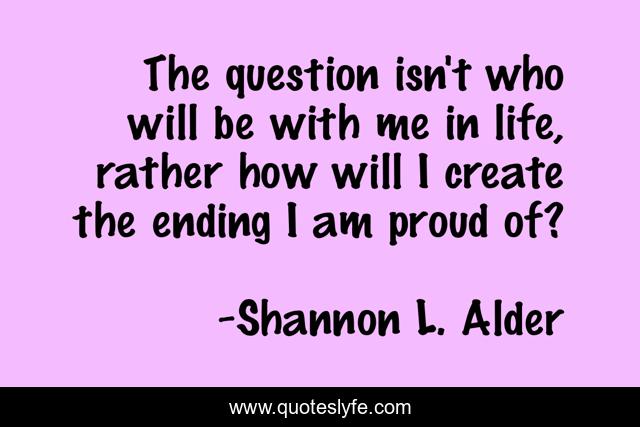 This page presents the quote "The question isn't who will be with me in life, rather how will I create the ending I am proud of?". Author of this quote is Shannon L. Alder. This quote is about relationships, life, love, truman-show, humor, affection, smile, happiness, parody,.