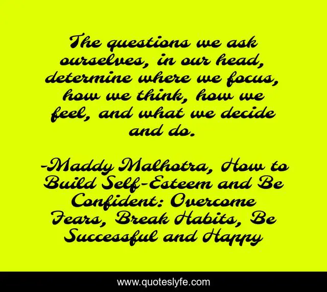 "Maddy Malhotra, How to Build Self-Esteem and Be Confident: Overcome Fears, Break Habits, Be Successful and Happy Quotes." Quoteslyfe.com, 2025. Fri. 05 Dec. 2025. <https://www.quoteslyfe.com/quote/The-questions-we-ask-ourselves-in-our-179769>.