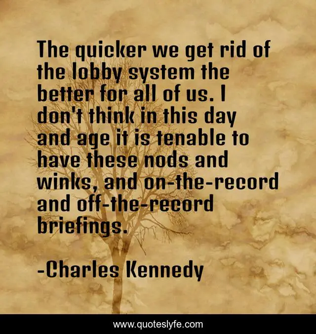 This page presents the quote "The quicker we get rid of the lobby system the better for all of us. I don't think in this day and age it is tenable to have these nods and winks, and on-the-record and off-the-record briefings.". Author of this quote is Charles Kennedy. This quote is about better, day, think,.