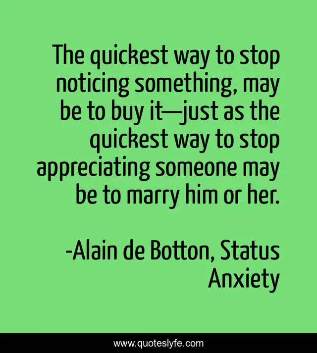 This page presents the quote "The quickest way to stop noticing something, may be to buy it—just as the quickest way to stop appreciating someone may be to marry him or her.". Author of this quote is Alain de Botton, Status Anxiety. This quote is about consumerism, marriage, psychology,.
