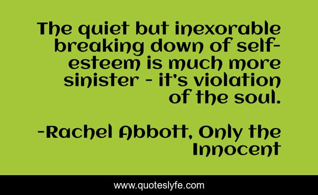 This page presents the quote "The quiet but inexorable breaking down of self-esteem is much more sinister - it’s violation of the soul.". Author of this quote is Rachel Abbott, Only the Innocent. This quote is about abusive-relationships, abuse, soulless,.