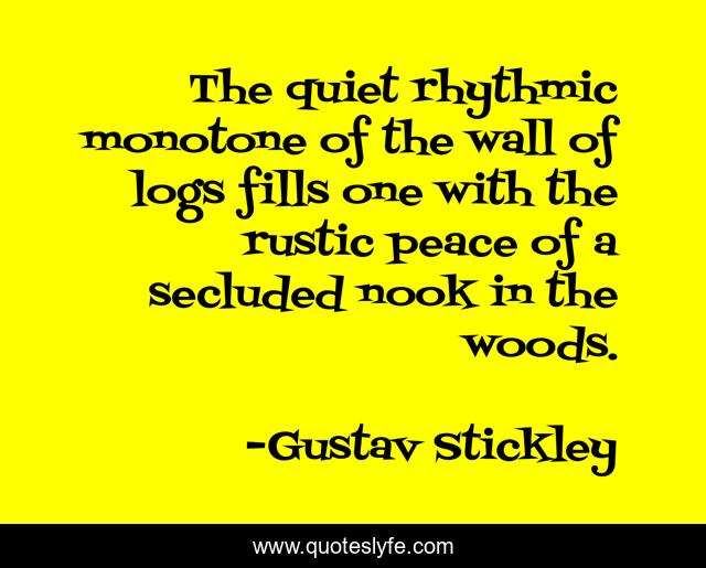 This page presents the quote "The quiet rhythmic monotone of the wall of logs fills one with the rustic peace of a secluded nook in the woods.". Author of this quote is Gustav Stickley. This quote is about wall, woods, quiet,.