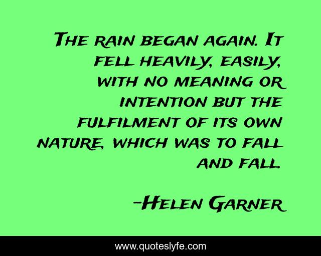 This page presents the quote "The rain began again. It fell heavily, easily, with no meaning or intention but the fulfilment of its own nature, which was to fall and fall.". Author of this quote is Helen Garner. This quote is about meaning, rain, fall,.