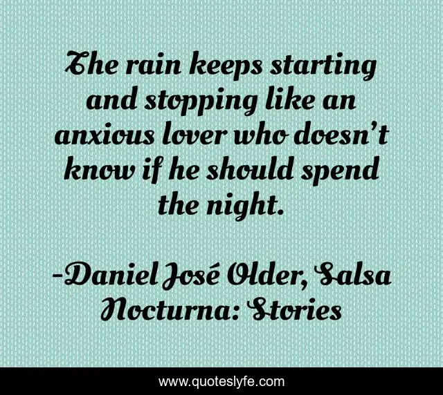 This page presents the quote "The rain keeps starting and stopping like an anxious lover who doesn’t know if he should spend the night.". Author of this quote is Daniel José Older, Salsa Nocturna: Stories. .