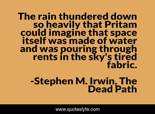 This page presents the quote "The rain thundered down so heavily that Pritam could imagine that space itself was made of water and was pouring through rents in the sky's tired fabric.". Author of this quote is Stephen M. Irwin, The Dead Path. This quote is about firmament, downpour, rain, weather, storm, flooding,.