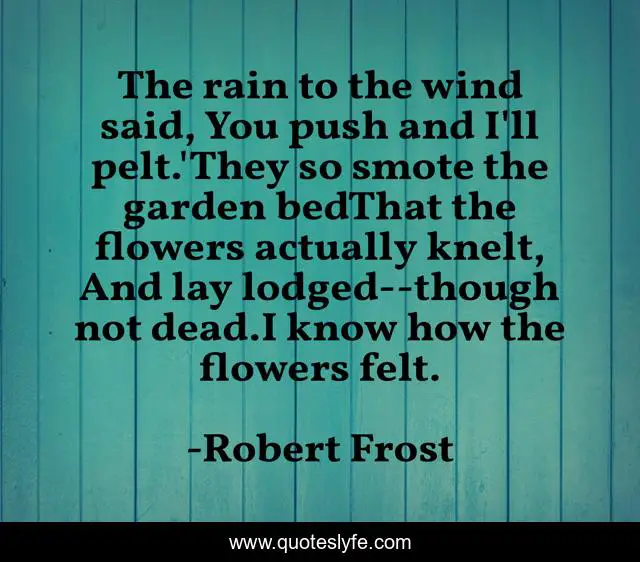 This page presents the quote "The rain to the wind said, You push and I'll pelt.'They so smote the garden bedThat the flowers actually knelt, And lay lodged--though not dead.I know how the flowers felt.". Author of this quote is Robert Frost. This quote is about poetry, rain,.