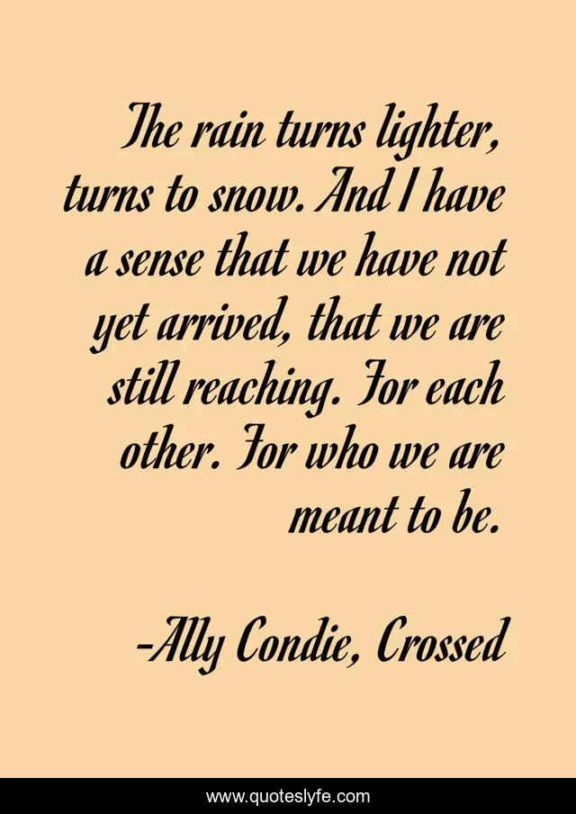 This page presents the quote "The rain turns lighter, turns to snow. And I have a sense that we have not yet arrived, that we are still reaching. For each other. For who we are meant to be.". Author of this quote is Ally Condie, Crossed. This quote is about poetic-prose, snow, rain,.