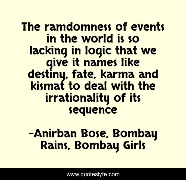 This page presents the quote "The ramdomness of events in the world is so lacking in logic that we give it names like destiny, fate, karma and kismat to deal with the irrationality of its sequence". Author of this quote is Anirban Bose, Bombay Rains, Bombay Girls. This quote is about enthusiasm, philosophy, inspirational, life-lessons,.