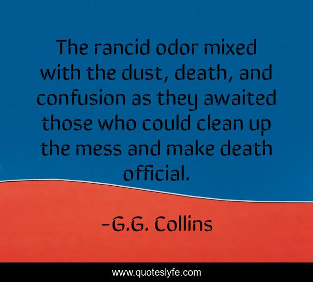 This page presents the quote "The rancid odor mixed with the dust, death, and confusion as they awaited those who could clean up the mess and make death official.". Author of this quote is G.G. Collins. This quote is about native-american, paranormal-mystery, evil-spirit, spirit-animal, ghosts, psychic-medium,.