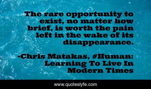 This page presents the quote "The rare opportunity to exist, no matter how brief, is worth the pain left in the wake of its disappearance.". Author of this quote is Chris Matakas, #Human: Learning To Live In Modern Times. This quote is about loss, death, impermanence, death-and-dying,.