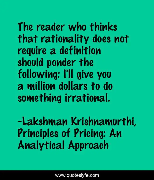 This page presents the quote "The reader who thinks that rationality does not require a definition should ponder the following: I'll give you a million dollars to do something irrational.". Author of this quote is Lakshman Krishnamurthi, Principles of Pricing: An Analytical Approach. This quote is about definition, rational-self-interest, economics, rationality, irrationality, 2012,.