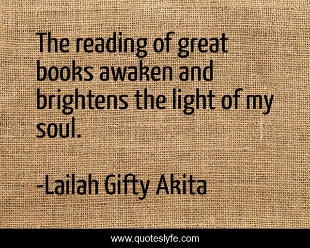 This page presents the quote "The reading of great books awaken and brightens the light of my soul.". Author of this quote is Lailah Gifty Akita. This quote is about light, books-reading, soul,.