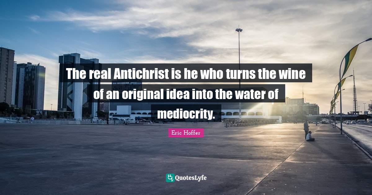This page presents the quote "The real Antichrist is he who turns the wine of an original idea into the water of mediocrity.". Author of this quote is Eric Hoffer. This quote is about water, real, turns, wine, antichrist, mediocrity, ideas,.