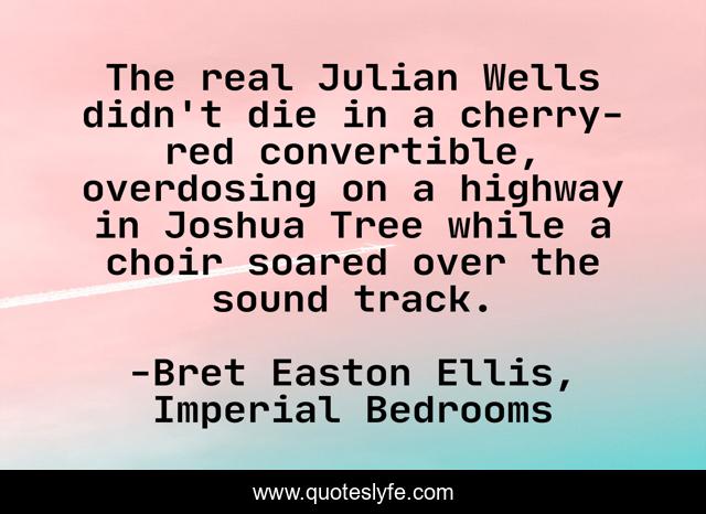 This page presents the quote "The real Julian Wells didn't die in a cherry-red convertible, overdosing on a highway in Joshua Tree while a choir soared over the sound track.". Author of this quote is Bret Easton Ellis, Imperial Bedrooms. This quote is about fiction, reality, consequences, writing,.