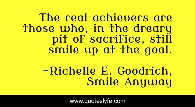 This page presents the quote "The real achievers are those who, in the dreary pit of sacrifice, still smile up at the goal.". Author of this quote is Richelle E. Goodrich, Smile Anyway. This quote is about sacrifice, struggles, aims, achievers, accomplishments, richelle, goals, ambition, richelle-goodrich,.