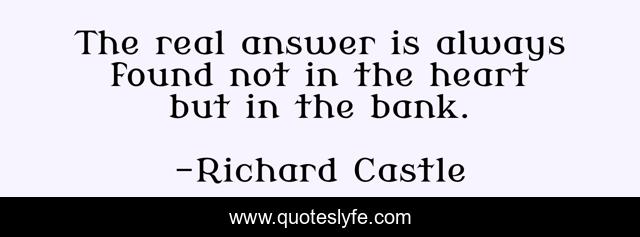 This page presents the quote "The real answer is always found not in the heart but in the bank.". Author of this quote is Richard Castle. This quote is about money, answers,.