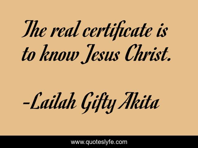 This page presents the quote "The real certificate is to know Jesus Christ.". Author of this quote is Lailah Gifty Akita. This quote is about jesus-christ, inspiring, education, certificate, humorous, wise-sayings, christianity, theology,.