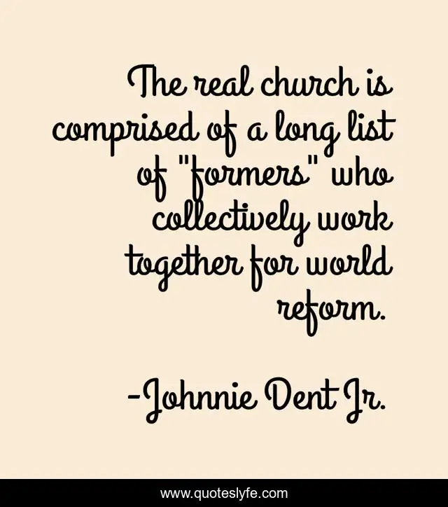 This page presents the quote "The real church is comprised of a long list of "formers" who collectively work together for world reform.". Author of this quote is Johnnie Dent Jr.. This quote is about church-leaders, reformation, church, church-calling, church-members, reforming-the-church,.