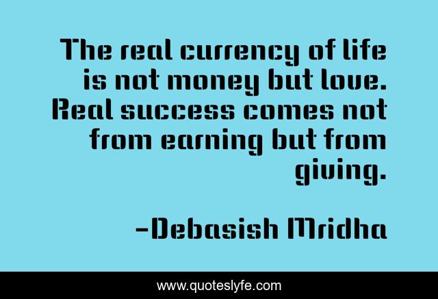 This page presents the quote "The real currency of life is not money but love. Real success comes not from earning but from giving.". Author of this quote is Debasish Mridha. This quote is about currency-of-life, miraboli, love, success, giving, philosophy, debasish-mridha, debasish-mridha-md, inspirational,.