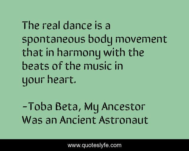 This page presents the quote "The real dance is a spontaneous body movement that in harmony with the beats of the music in your heart.". Author of this quote is Toba Beta, My Ancestor Was an Ancient Astronaut. This quote is about body, heart, dance, beats, music, harmony, movement,.